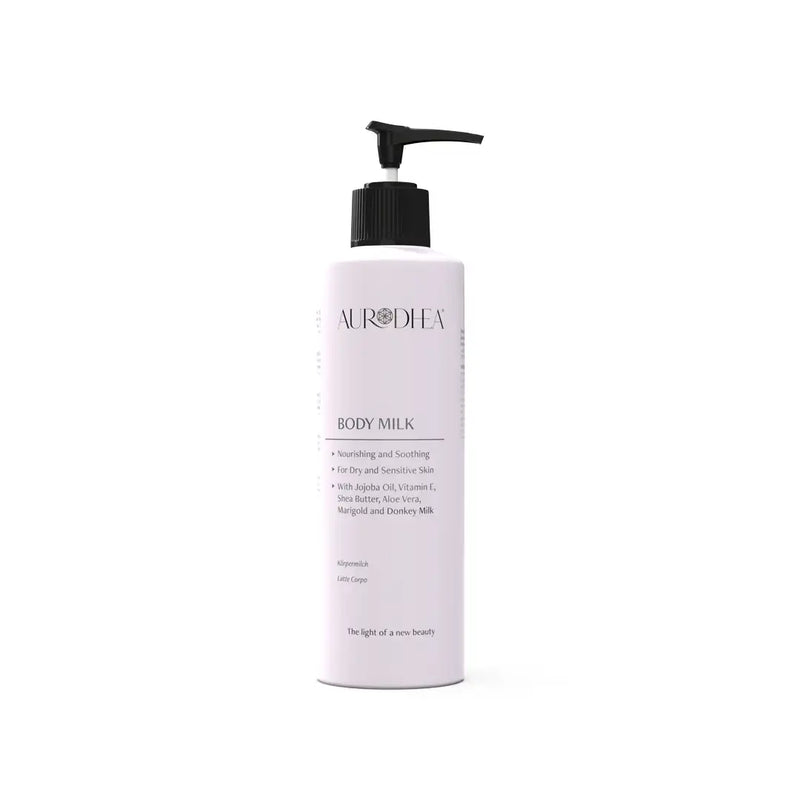 Aurodhea Körpermilch mit Eselsmilch versorgt die Haut intensiv mit Feuchtigkeit, lindert Trockenheit und schützt vor Reizungen. Ihre sanfte, hypoallergene Formel eignet sich besonders für empfindliche und zu Irritationen neigende Haut.